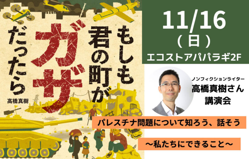 - 11月16日『パレスチナ問題について知ろう、話そう~私たちにできること~』高橋真樹さん講演会今、パレスチナのガザ地区、ヨルダン川西岸地区では 何が起きているのか?なぜこのような状況になってしまったのか、 どうして国際社会は… 続きを読む: 11月16日『パレスチナ問題について知ろう、話そう~私たちにできること~』高橋真樹さん講演会